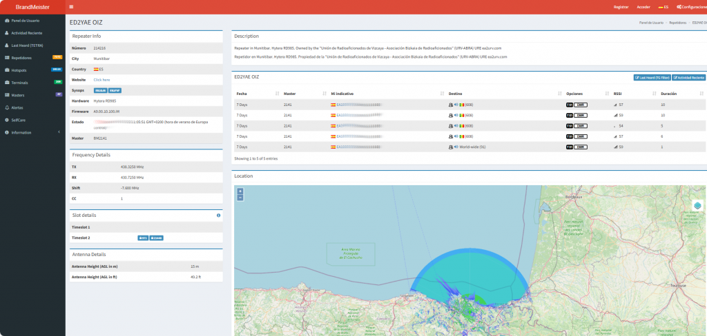 Datos técnicos DMR ED2YAE en Brandmeister (frecuencia de trabajo, actividad en tiempo real, mapa cobertura, configuración sltos, TGs…)